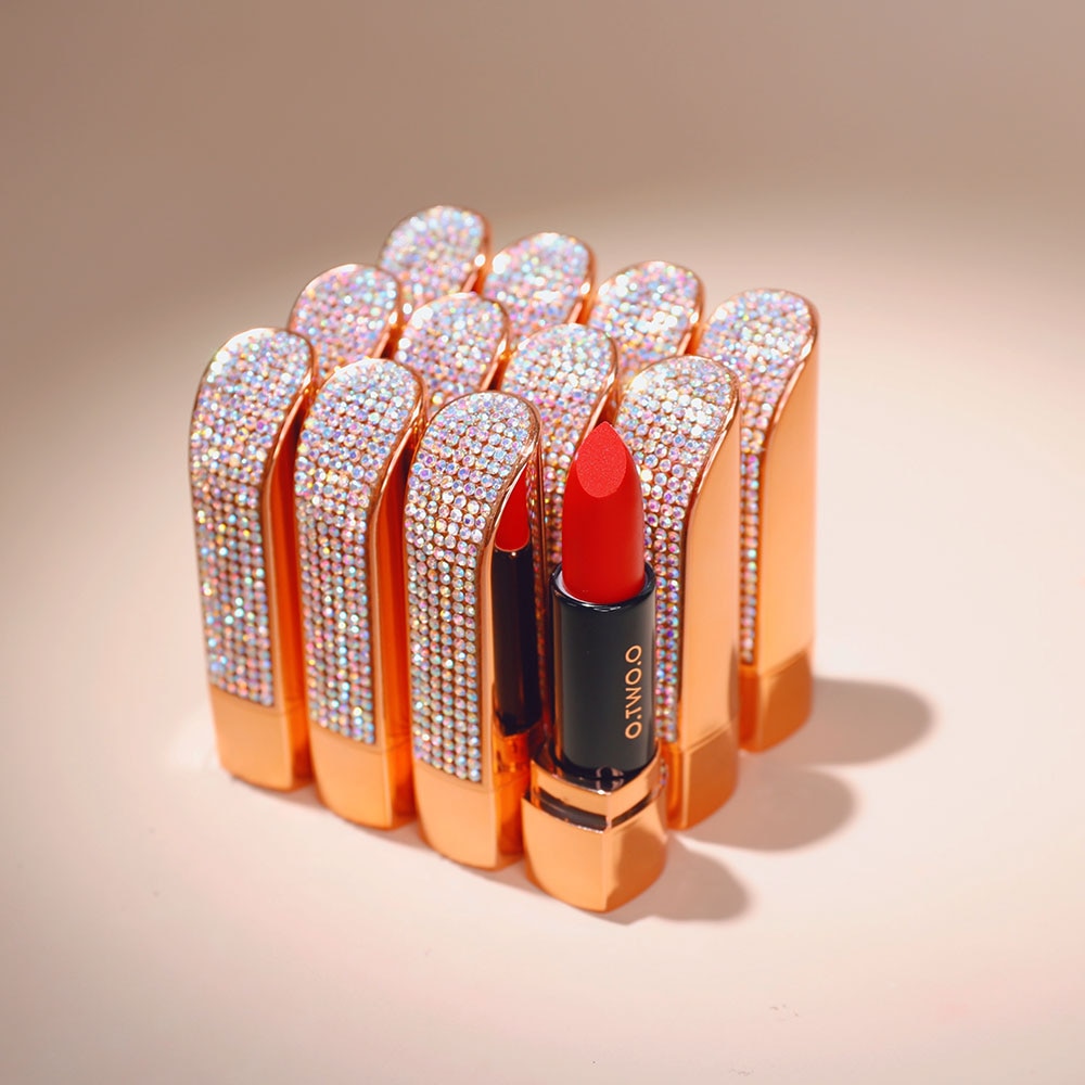Design luxuoso e brilhante. O design deste batom é muito especial. A embalagem é toda incrustada com strass cintilantes, o que deixa o batom mais luxuoso.
