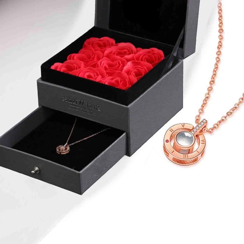 Este colar de charme tem uma mensagem secreta, dentro dele você descobrirá que "I Love You" está escrito em 100 idiomas diferentes! Colocar a lanterna do celular através do vidro do colar irá também projetar a mensagem oculta em uma parede.